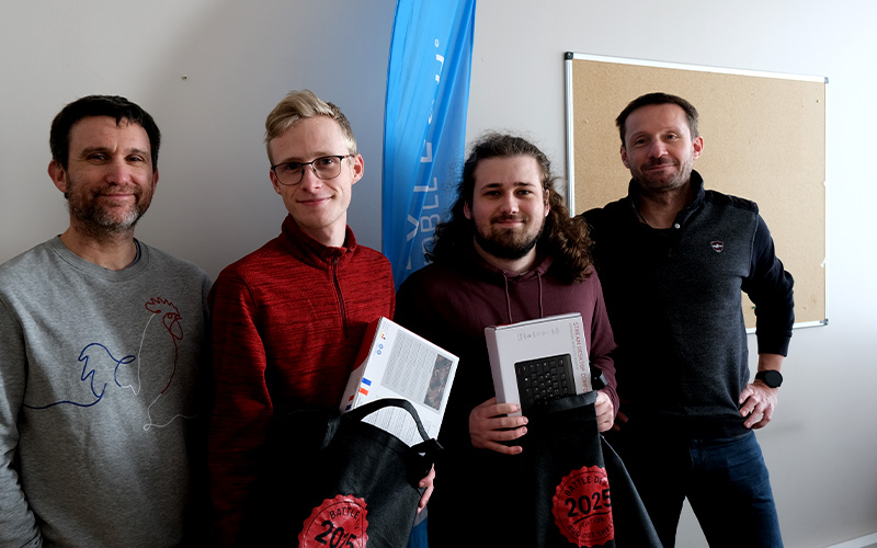 Cette année, ce sont deux étudiants en INFO 5, Samuel Lepin et Pierre Bernard qui ont remporté le prix au niveau de l’établissement. Ils ont reçu leur prix, un pack comprenant clavier et souris, des mains de Julien Blanchard, chef de projet et Christophe Droguet, Scrum Master chez Thales.