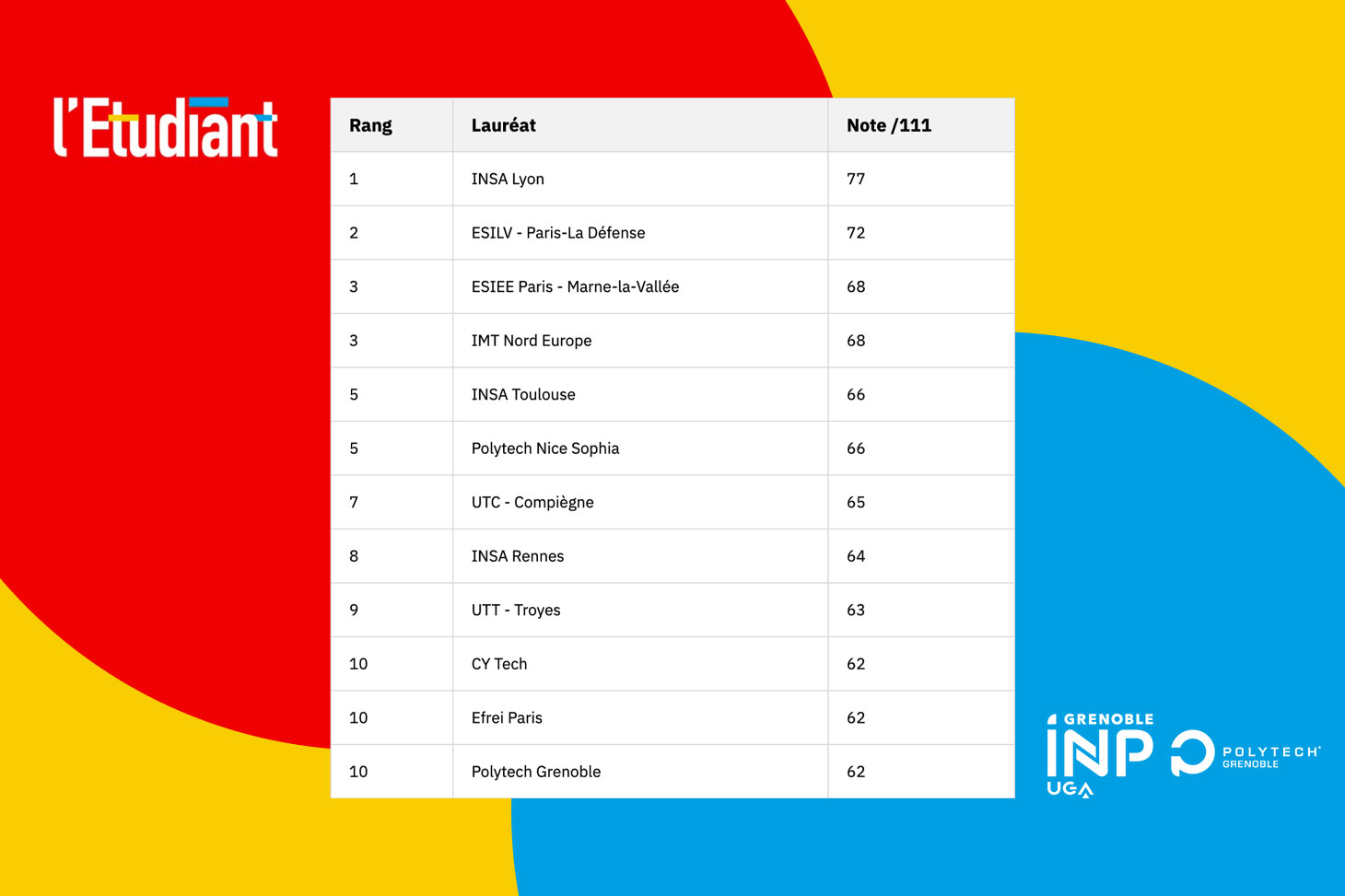 Polytech Grenoble arrive en 10ème position du classement des écoles d’ingénieur·e·s post-bac avec une note de 62 sur 111 !